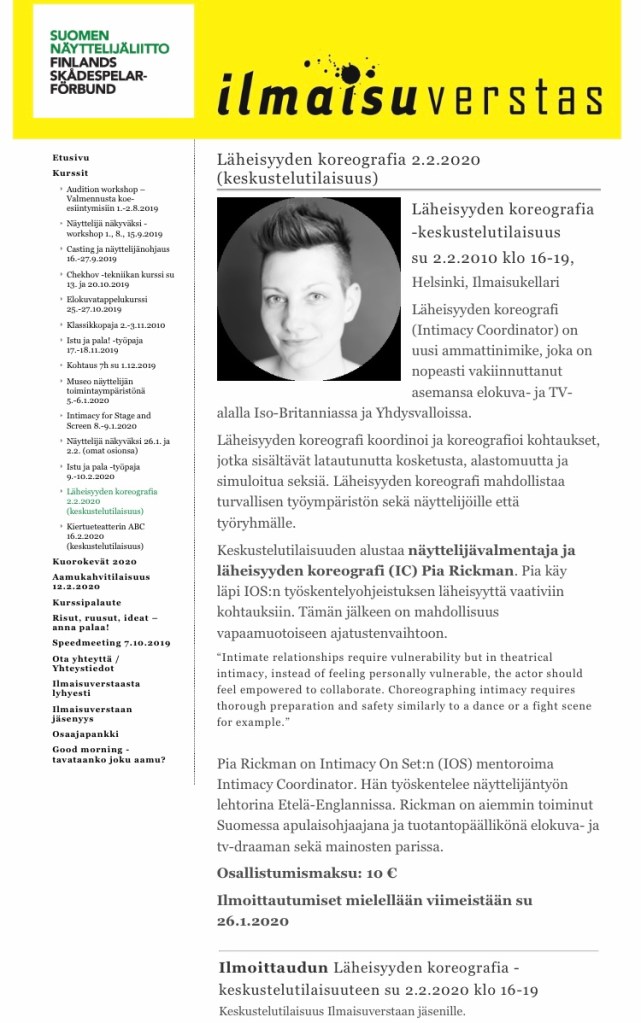 Working with an Intimacy Coordinator guide is now out! Sex and intimacy have always been part of engaging storytelling because these scenes convey strong feelings and powerful emotions to an audience. Effective intimate scenes have potential to advance the story and reveal something new about the characters and their relationships. In the Finnish Film Foundation’s intimacy guidelines (10/2020), the use of Intimacy Coordinators (IC) in the industry was recommended to be increased. In 2021, Pia was commissioned to put together a guide for working with an intimacy coordinator. This guide was published and endorsed by Finnish Film Foundation, Audiovisual Producers Finland and Finland’s Actors’ union.